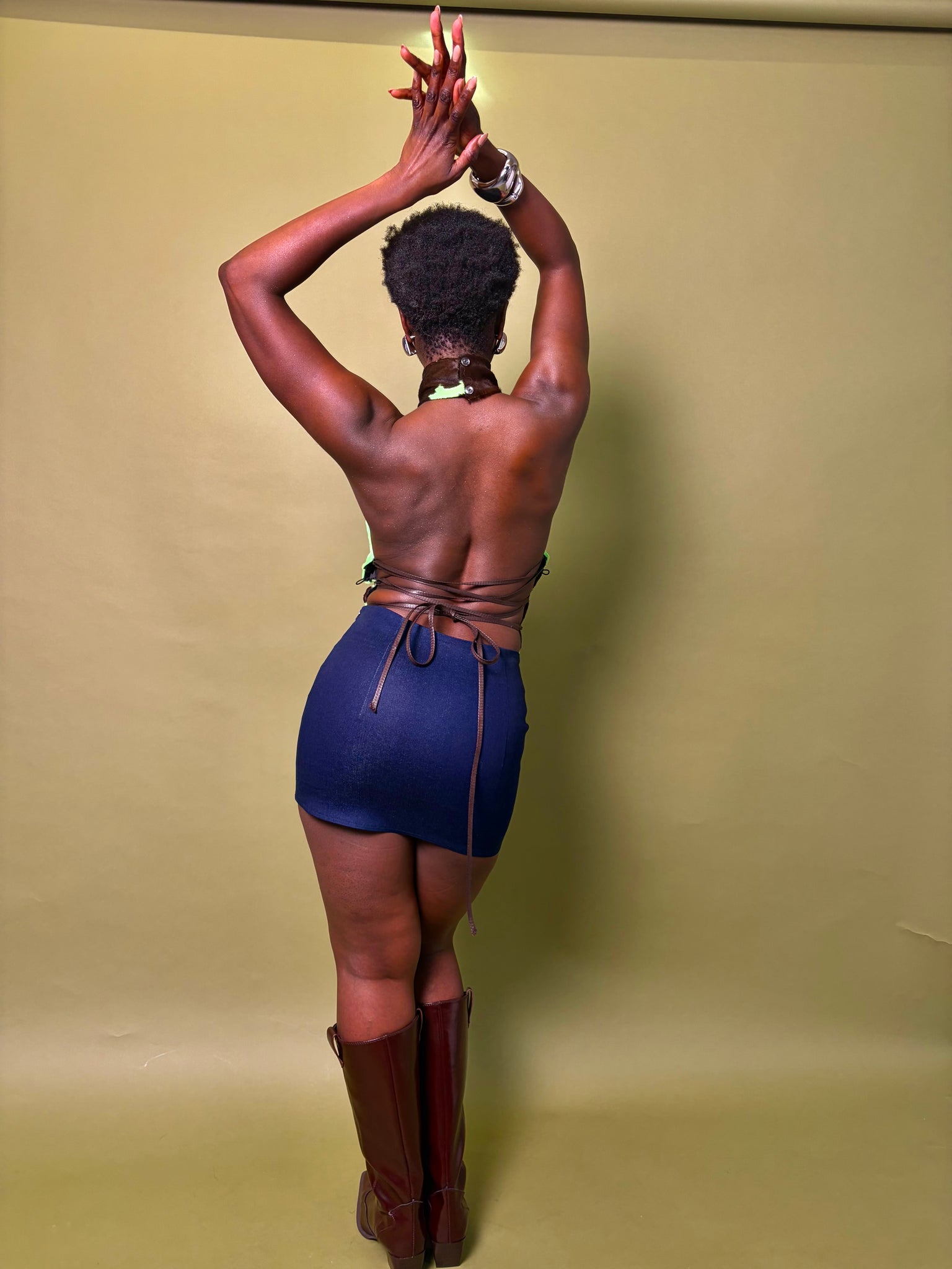 The Velencia halter neck fitted top is inspired by 70’s fashion but with a classic timeless, chic look with lace up detailing on the back.